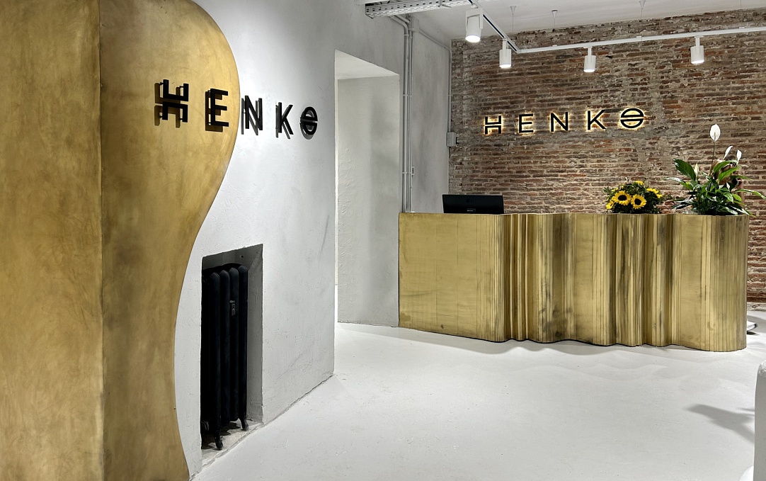 С первого шага гости попадают в атмосферу современного минимализма с тёплым акцентом. Золотистая стойка с волнообразной текстурой на фоне кирпичной стены задаёт тон пространству: уверенный, стильный, с ноткой скандинавской философии. Подсвеченный логотип HENKØ и живые цветочные композиции добавляют ощущение уюта и внимания к деталям.