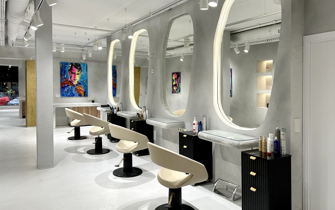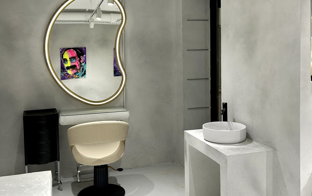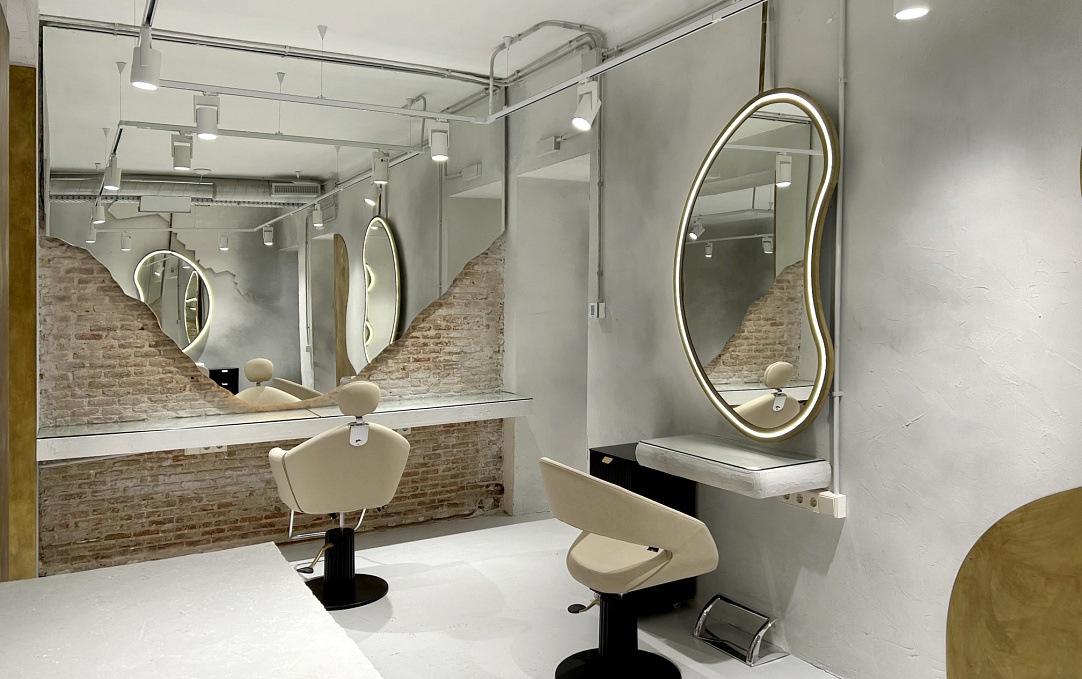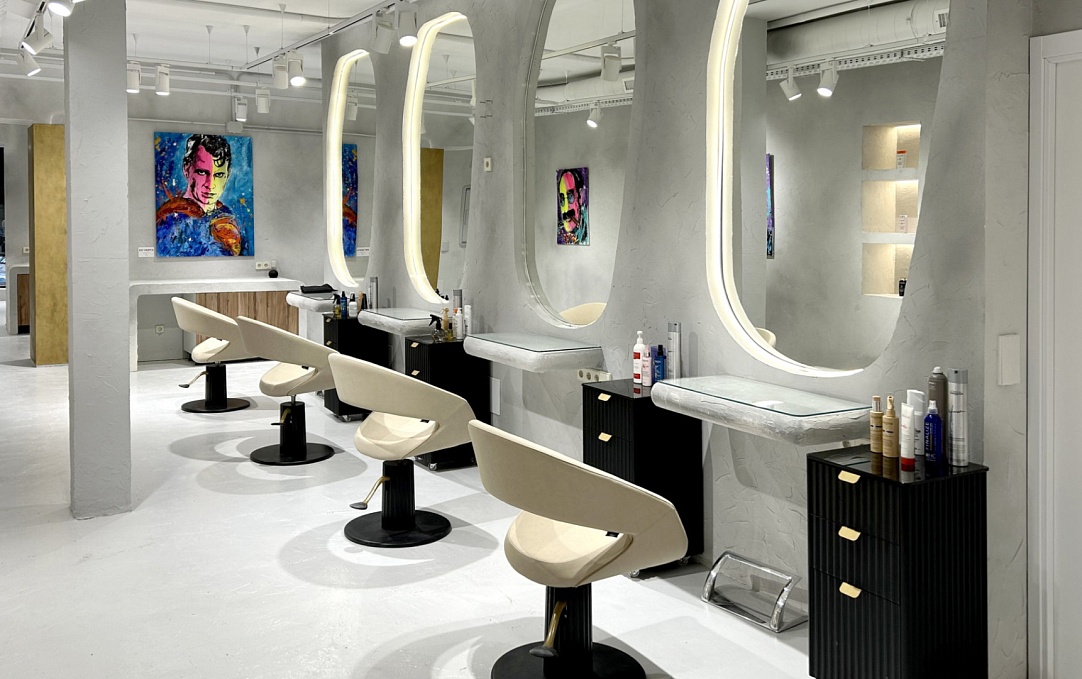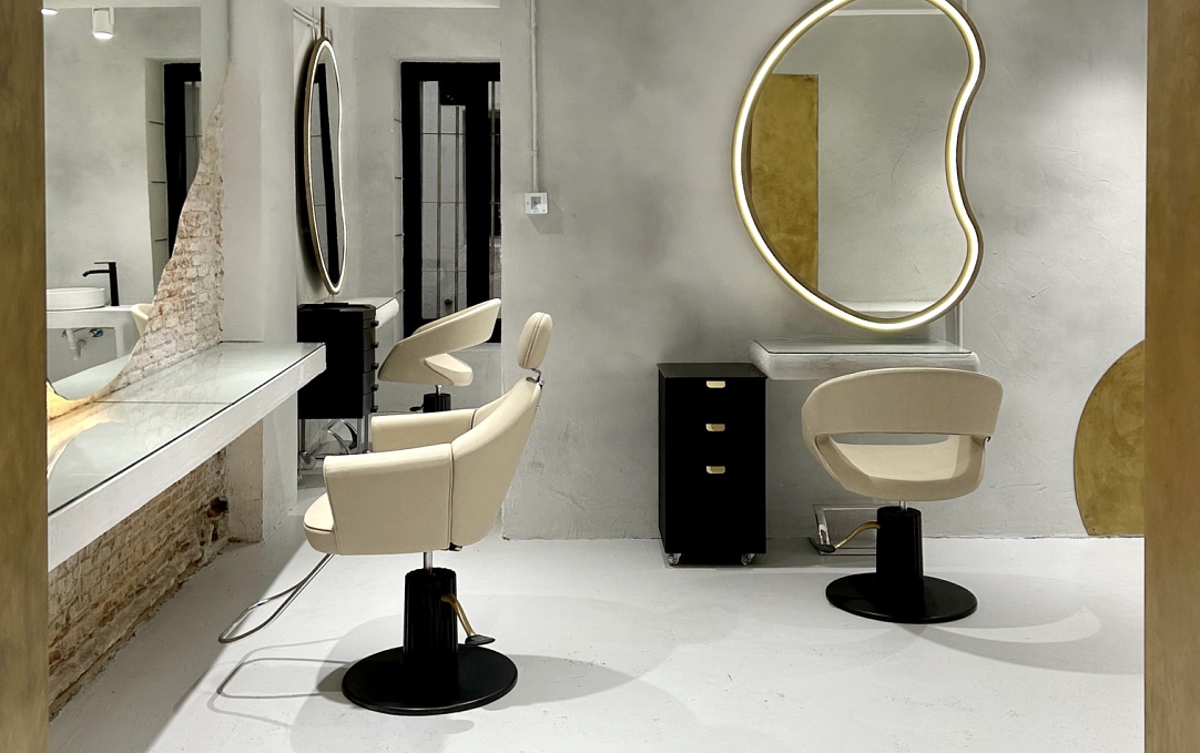Рабочие места оформлены в светлой палитре с овальными зеркалами, встроенными в скульптурные ниши. Бежевые кресла CARUSO, лаконичные тележки SARAH и художественные портреты на стенах создают атмосферу творческой свободы. Здесь каждая процедура превращается в персональный ритуал красоты.