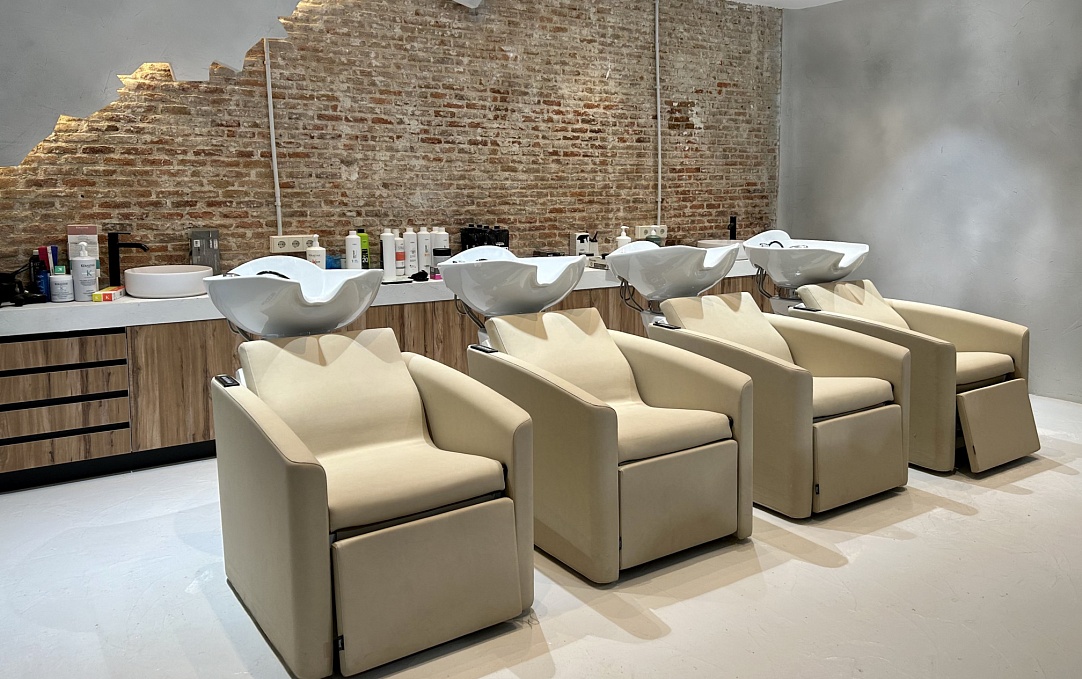 Пространство для ухода за волосами оформлено в природных тонах: мягкие парикмахерские мойки PRIMA CLASSE, белые керамические раковины, деревянные поверхности и кирпичная стена с серой штукатуркой. Это зона полного расслабления, где приглушённый свет и натуральные текстуры помогают отключиться от суеты и почувствовать заботу.